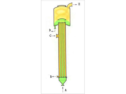 這種蒸發(fā)器的特征是具有長的加熱管(約為5~7M),但加熱室和沸騰室之間的溫度差也要大,否則,蒸汽流的能量不足于輸送液體和產生爬升的膜。